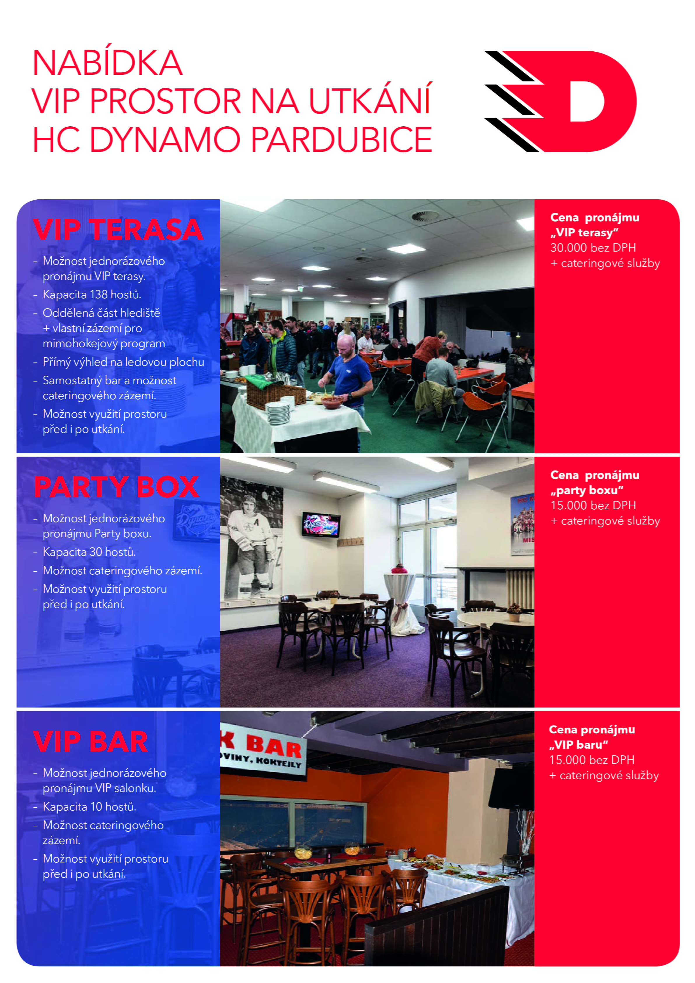 Nabízíme Vám možnost využití VIP TERASY, PARTY BOXU či VIP baru. Zarezervujte si je na vybrané zápasy co nejdříve! Více informací o možnostech spolupráce s Dynamem vám velmi rádi sdělí z obchodního oddělení klubu Miroslav Novotný (mirek.novotny@hcdynamo.cz, tel. 777 820 416) nebo Zdeněk Rydlo (zdenek.rydlo@hcdynamo.cz, tel. 734 224 010).